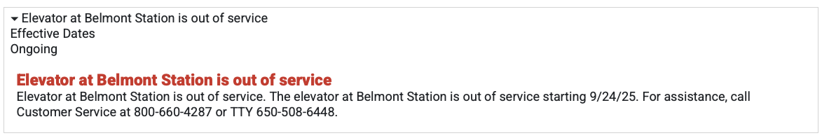 "Elevator at Belmont Station is out of service", because of course it is. I love that the "effective dates" of the notice is just "ongoing". Yep, can confirm.