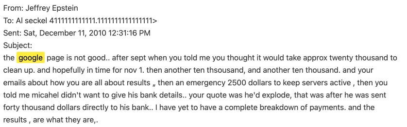 In the trove of documents released this week, Epstein at times seems preoccupied with Google results related to him. In an email dated December 10th, 2010, Epstein complains that “the google page is not good,” and references what appears to be payments made to clean up search results. In other emails, associates give Epstein step by step instructions on searching in Incognito on Chrome. [Image:…